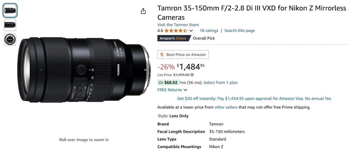 Amazon is having another one of their short and exclusive sales: the Tamron 35-150mm f/2-2.8 Di III VXD for Nikon Z is now $1,484.95, almost $500 or 26% off (sold and shipped by Amazon):