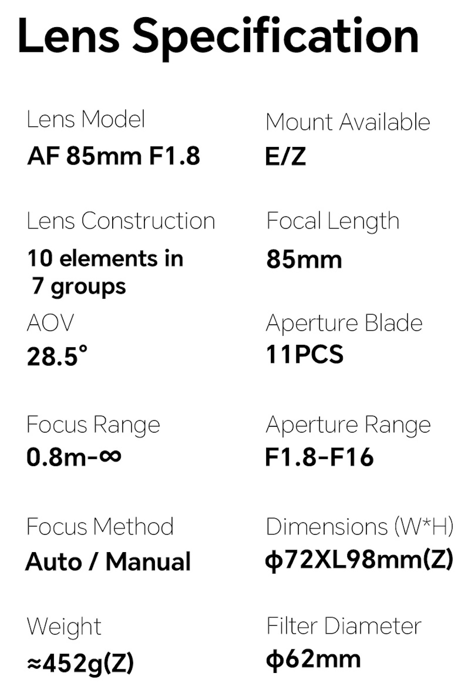 7Artisans AF 85mm f/1.8 Z mount lens main features: