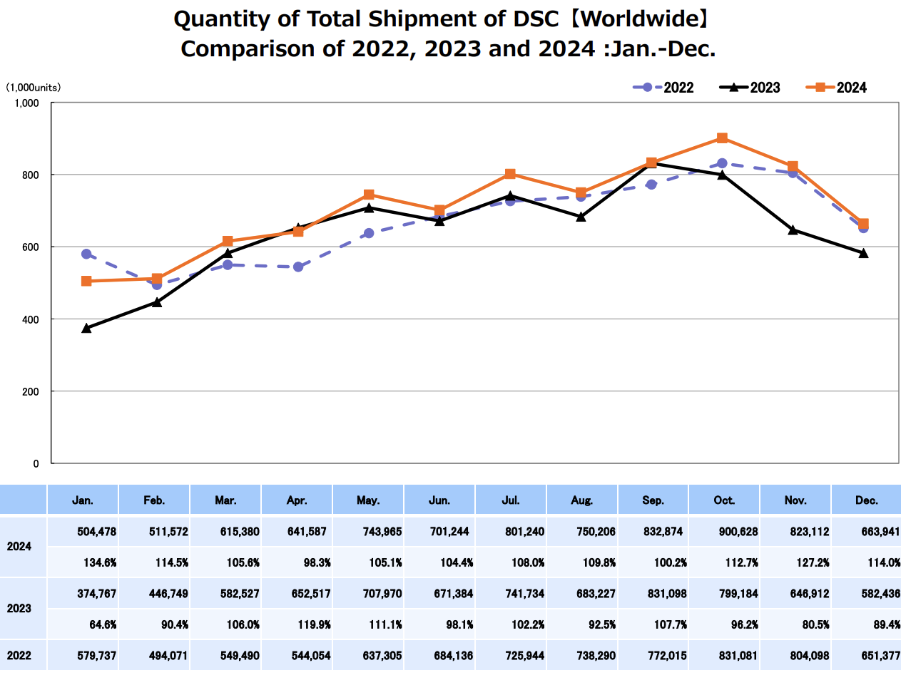 CIPA (Camera & Imaging Products Association in Japan) published their latest camera production data (orange: 2024, black: 2023, blue: 2022):