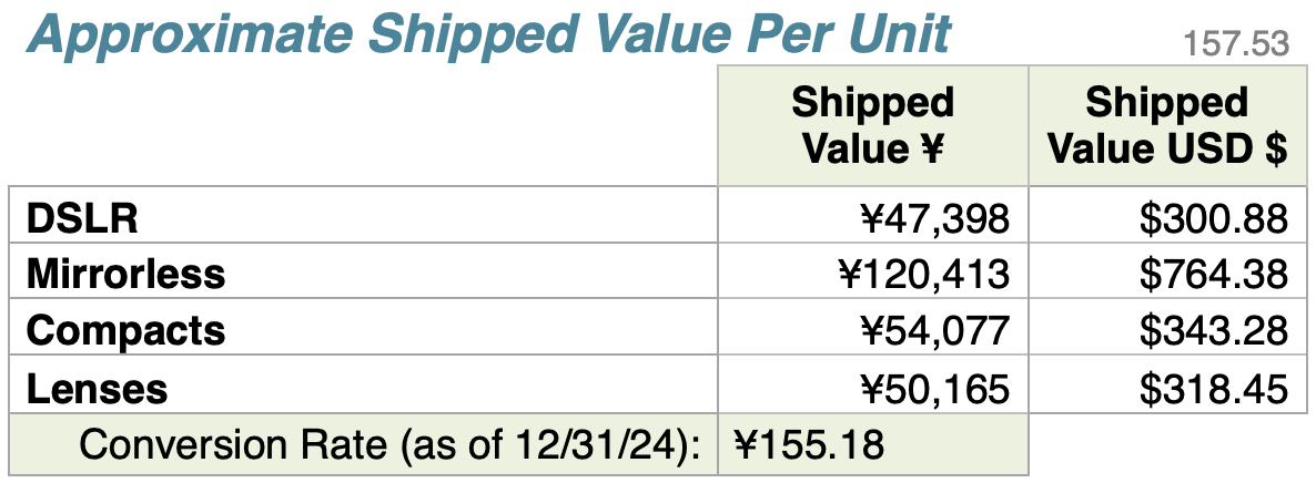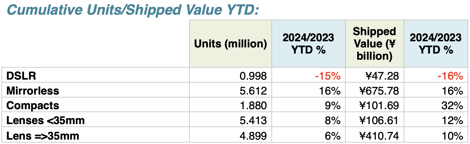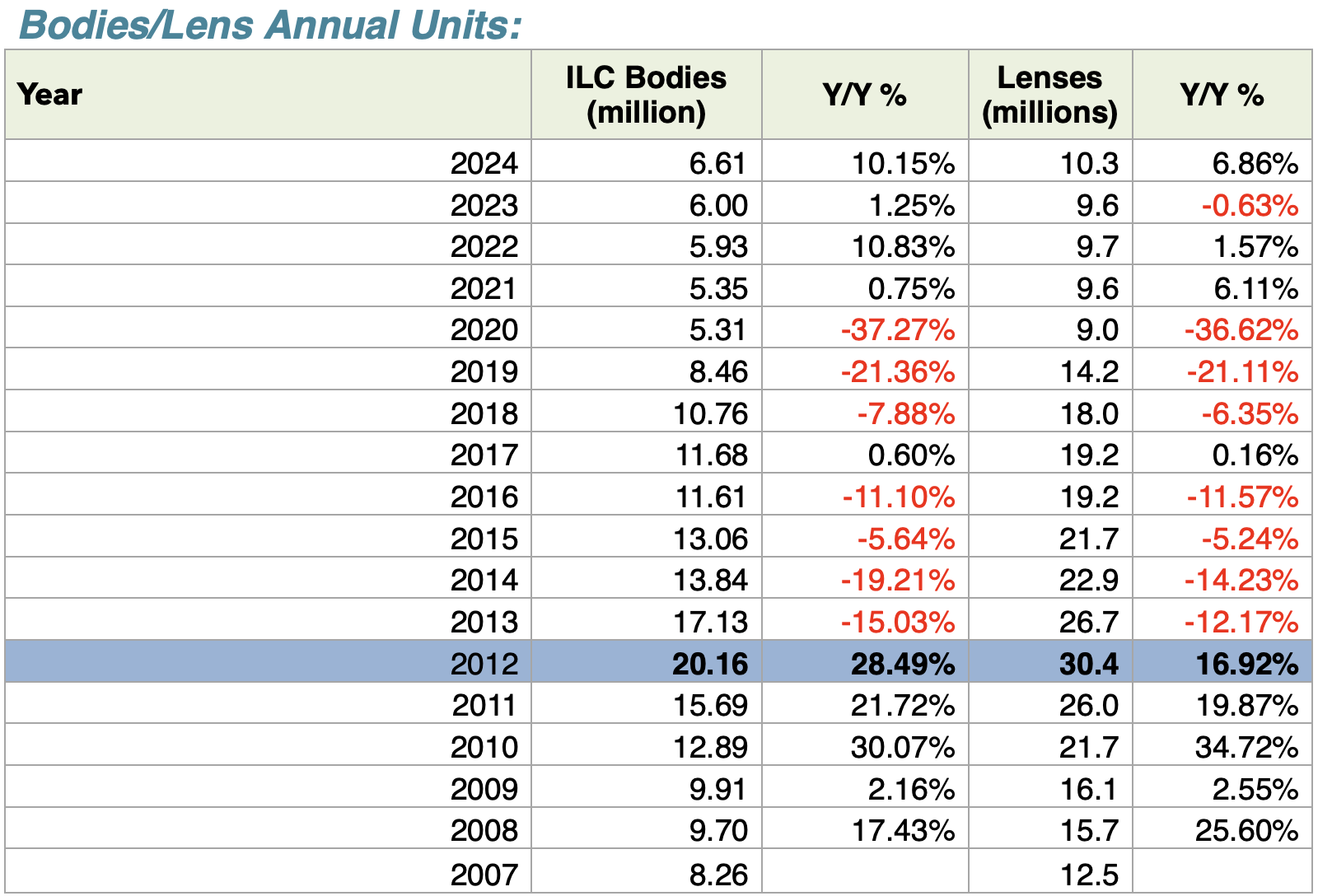 CIPA has predicted 5.89m ILCs, 1.52m compacts and 9.57m lenses for calendar 2024. The year came in at 6.61m ILCs, 1.88m compacts and 10.3m lenses. That’s the best showing since 2019, but ILC body shipments are still just 32.8% of 2012 and lenses are just 33.9% of 2012 shipments.