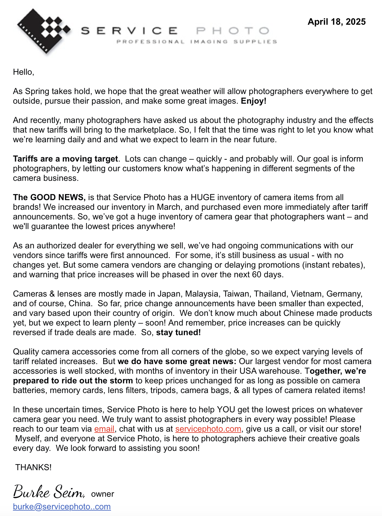 Here is the email Service Photo recently sent out to customers: