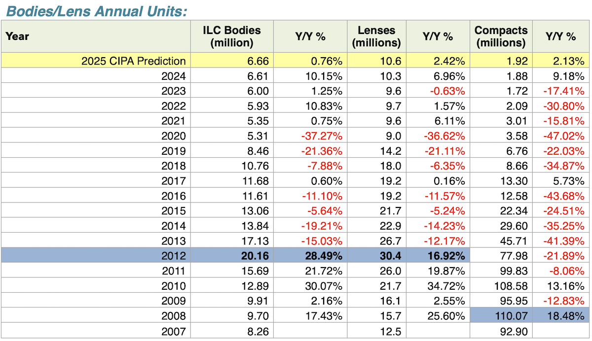 CIPA has predicted 6.66m ILCs, 1.1.92m compacts and 10.56m lenses for calendar 2025, a modest increase over 2024. We’re currently projecting between 5.389m and 7.184m ILC units.