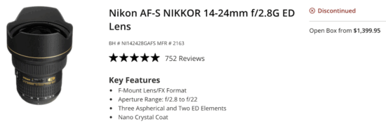 Update – the Nikon AF-S NIKKOR 14-24mm f/2.8G ED lens (F-mount) is listed as discontinued at B&H Photo.