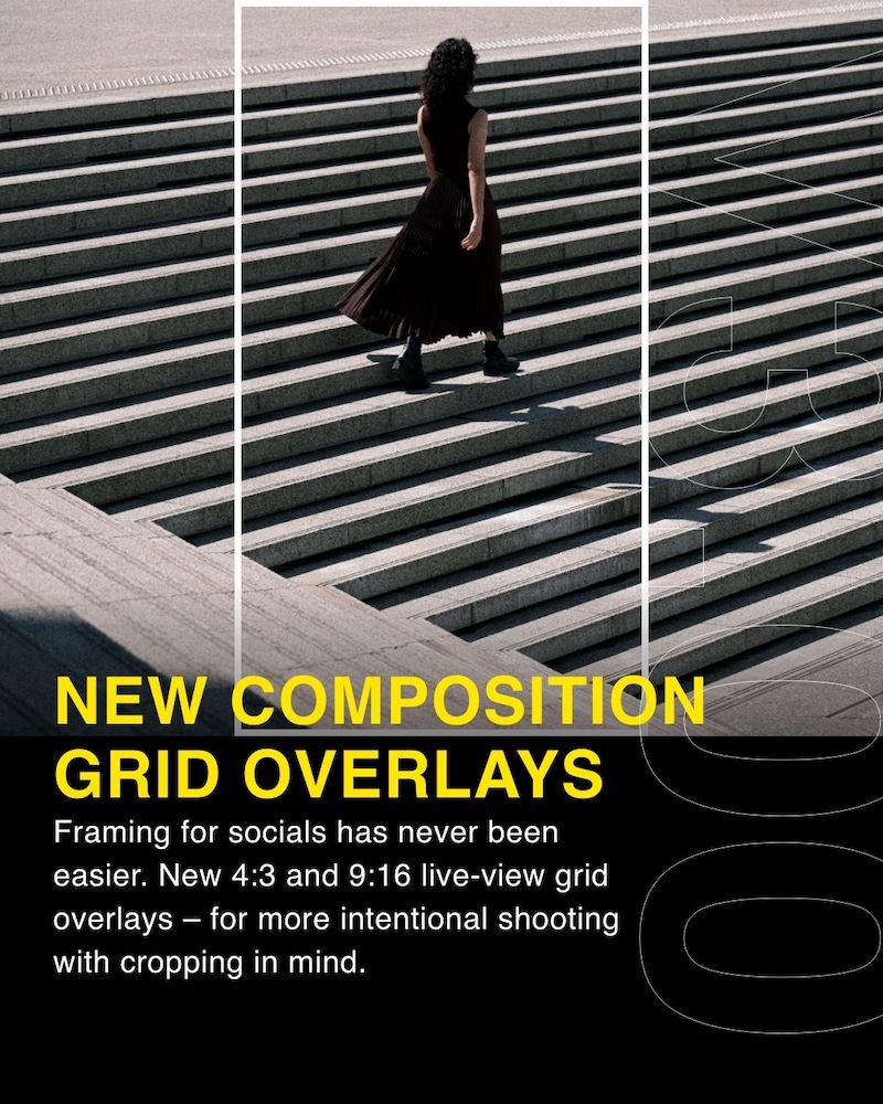 - An [Only during zoom] option has been added to [Focus peaking]. When selected, focus peaking is displayed only when enlarging the view for more precise manual focusing, and peaking is not displayed at other times. This makes it easier to check both your focus and composition. What’s more, a [Maximum aperture Lv] item that makes it easier to determine the focus peak with manual focusing has been added. New [Grid type] options, [4:3] for still-image live view and [9:16] for video live view, have also been added. These enable you to capture scenes with the ideal composition for social media use.