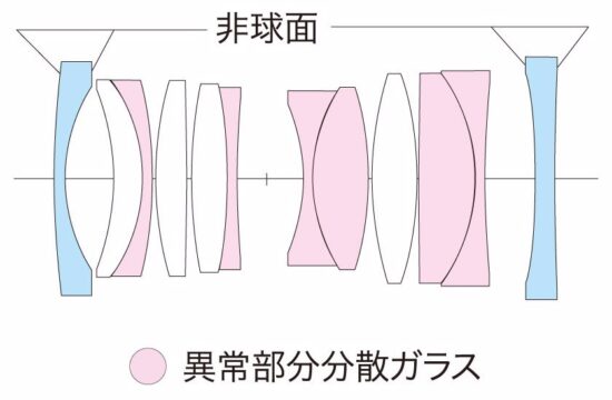 The lens consists of 12 elements in 8 groups, including 6 elements of anomalous partial dispersion glass and 2 double-sided aspherical lenses, and is also equipped with a floating mechanism.