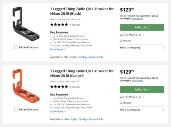 The 3 Legged Thing Zadie QD L-Bracket for Nikon Z6 III cameras is now back in stock (available in copper and black):