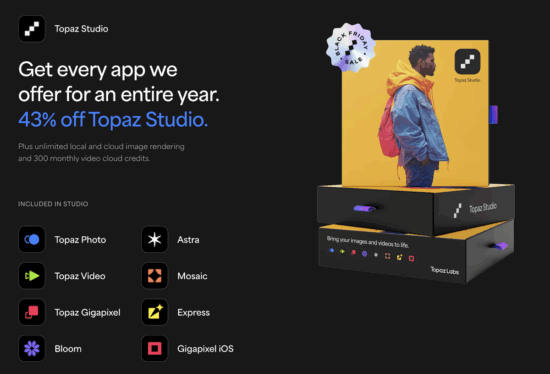 - 43% off Topaz Studio and Topaz Studio Pro (from $399 → $229)