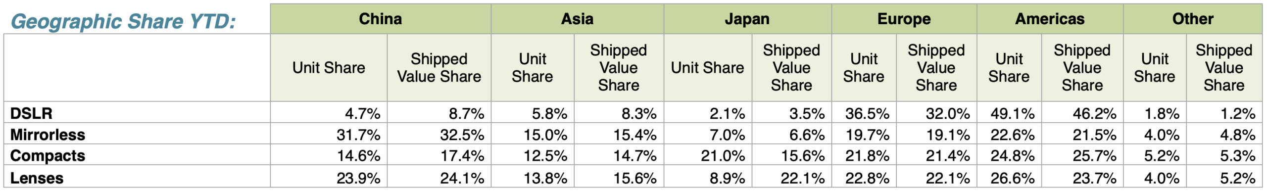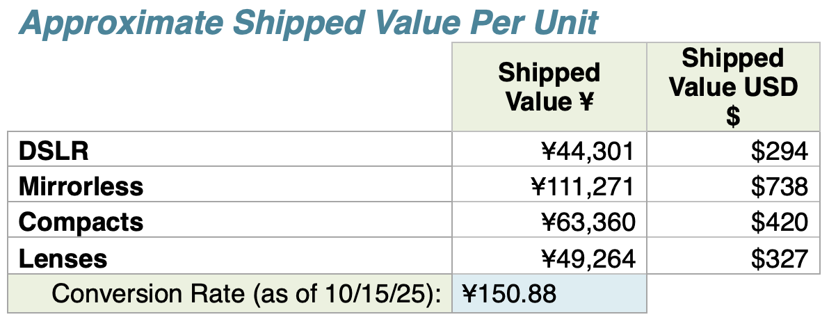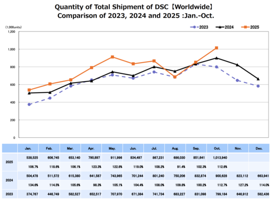 October 2025 shipments are up substantially from September 2025 and up from October 2024, except for DSLRs and full-frame lenses.