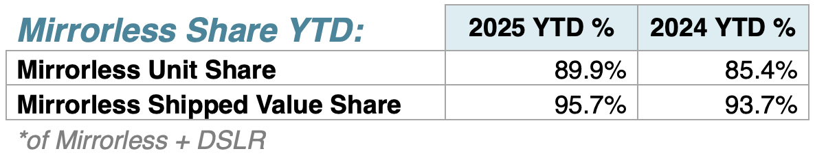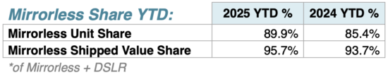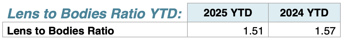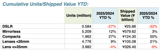 For the first ten months of 2025, DSLR’s are down 27% in units and 32% in shipped value, Mirrorless units are up 12% in units and 3% in shipped value. Compacts are up 27% in units and 50% in shipped value, Lenses for smaller than 35mm sensors are up 9% in units and 21% in shipped value, and lenses for 35mm and larger sensors are down 4% in units and down 6% in shipped value. The lens to body sales ratio has dropped to 1.51 compared to 1.57 a year ago.