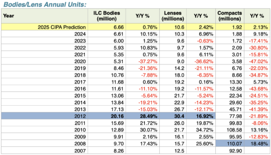 CIPA has predicted 6.66m ILCs, 1.1.92m compacts and 10.56m lenses for calendar 2025, a modest increase over 2024. We’re currently projecting between 6.95m and 7.02m ILC units. That’s up from last month’s prediction.