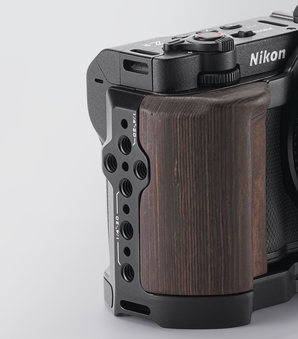 A built-in ergonomic wooden handle improves handheld operation, addressing the camera’s compact form factor by providing a more secure and comfortable grip.