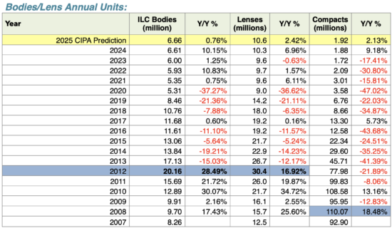 CIPA has predicted 6.66m ILCs, 1.1.92m compacts and 10.56m lenses for calendar 2025, a modest increase over 2024. We’re currently projecting between 6.93m and 6.98m ILC units. That’s down from last month’s prediction.
