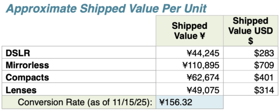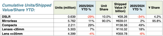 November 2025 shipments are down from October 2025 (but that’s normal for November since holiday shipments are over) and up from November 2024, except for DSLRs and APS-C lenses.