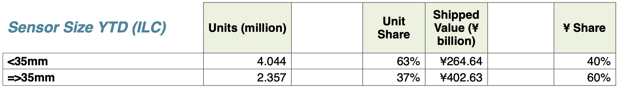 - Lenses for smaller than 35mm sensors are up 7% in units and 18% in shipped value and lenses for 35mm and larger sensors are down 4% in units and down 6% in shipped value.