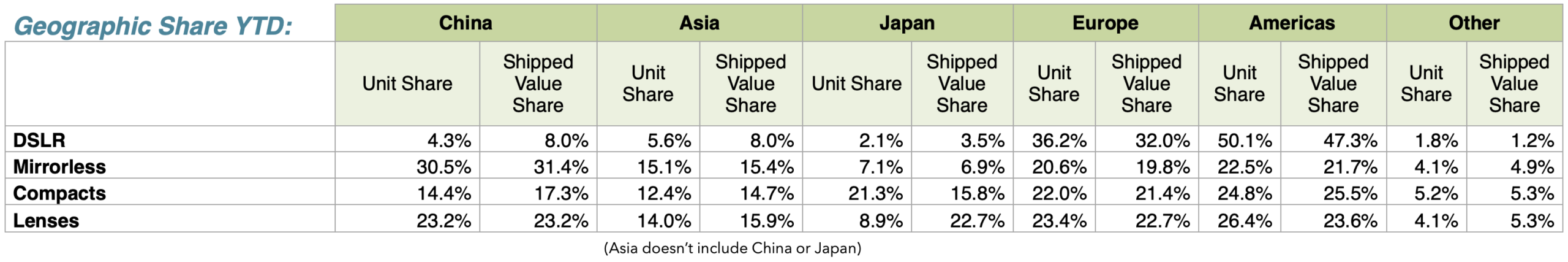 - Mirrorless units are up 11% in units and 2% in shipped value.