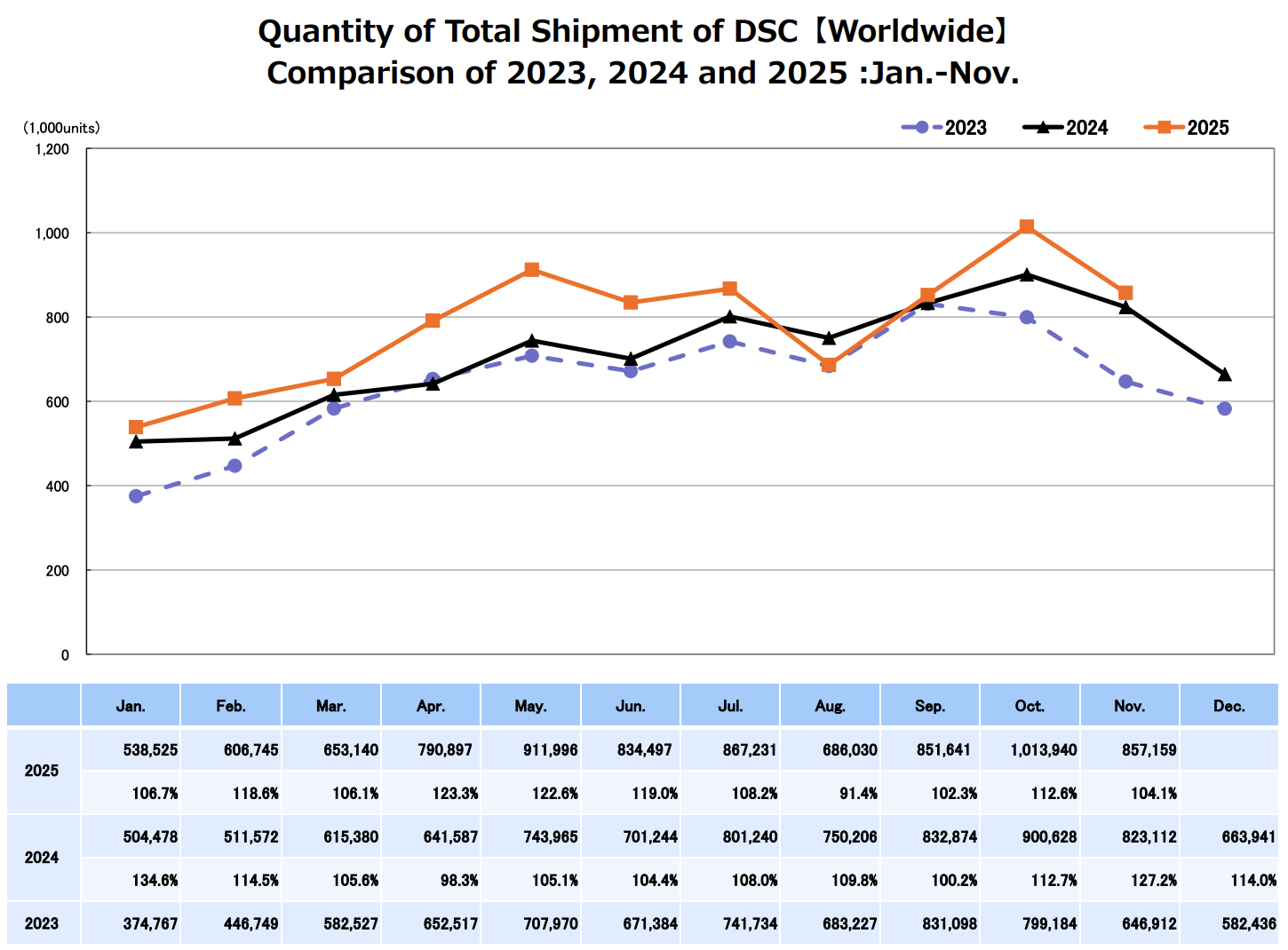 CIPA (Camera & Imaging Products Association in Japan) published their latest camera production data (orange: 2025, black: 2024, blue: 2023):