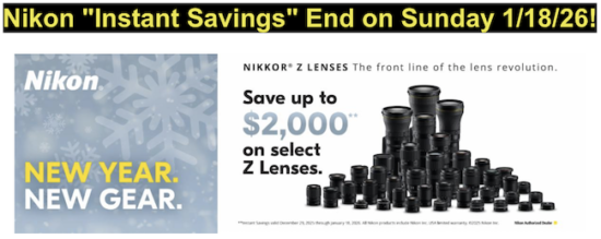 The Nikon USA rebates are ending tomorrow, January 18, 2026: B&H Photo | Paul’s Photo | Service Photo. Rebates by categories (see full list):