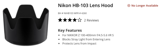 The Nikon HB-103 lens hood is designed for the Nikkor Z 100-400mm f/4.5-5.6 VR S lens. The Nikon Japan store clearly states that the product is an older model and that a new one is available. In the US, the Nikon HB-103 lens hood is also listed as discontinued: