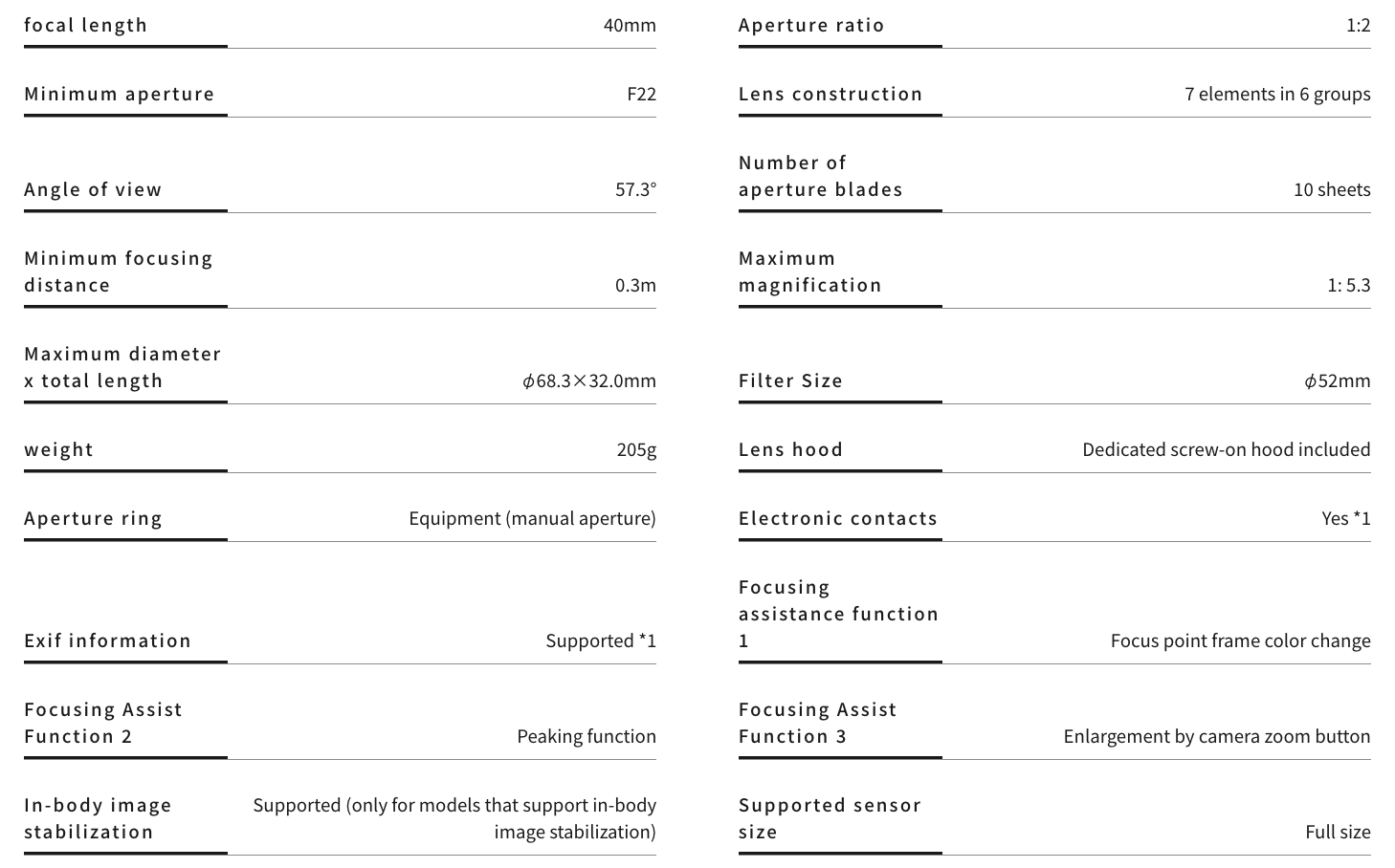 The SEPTON 40mm F2 Aspherical Z-mount has electronic contactpoint, Exif information through the combination of electronic communication-enabled body and latest firmware, and in-body handblemish correction (3-axis), and supports three types of pint-binding support functions (pint-binded by focus point frame color change, pint-match by peaking function, and pint-bonded by magnification button).
