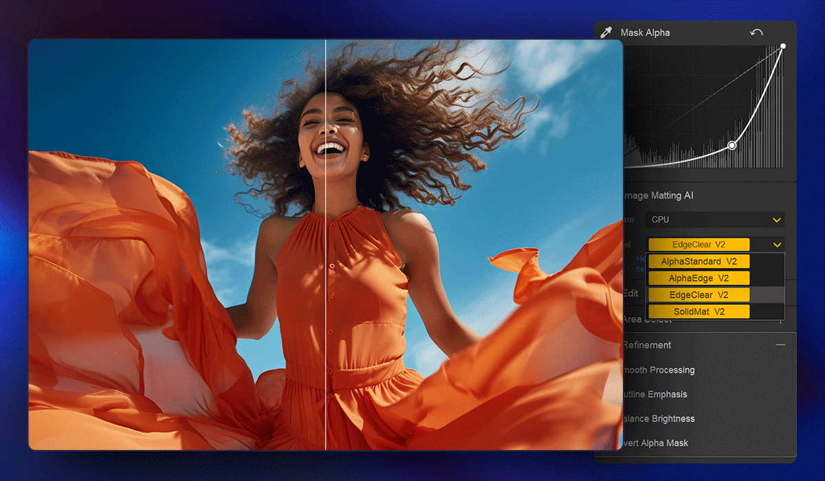 Unlike basic masks that produce only solid black-and-white selections, Aiarty Image Matting creates a detailed alpha matte that preserves semi-transparent edges, capturing flying hair, fine fur, glass, or complex borders. This ensures smooth, natural separations with retained detail and edge fidelity.