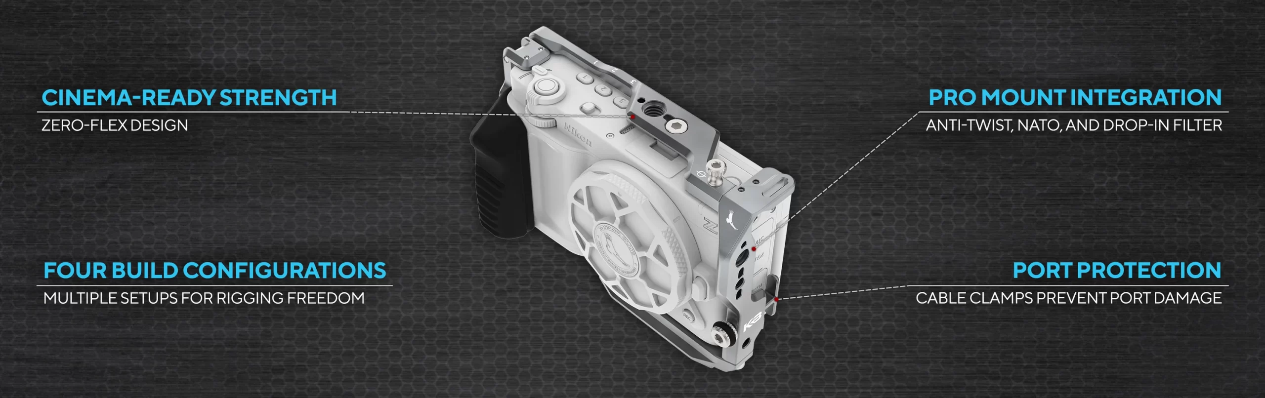 There is no doubt that the Nikon ZR is a powerhouse camera in a compact package for an impressive price. The KONDOR BLUE Nikon ZR cage took all of the use cases, strengths, and weaknesses into consideration throughout the design process. The grip, for instance, is essentially nonexistent so we added an integrated ergonomic rubber grip. Don’t need it? It can easily be removed while still maintaining the cage.