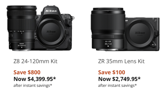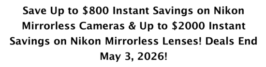 Nikon USA started new rebates for April 2026 – after reducing some of the savings in March, the new rebates are coming back even stronger (the new rebates are set to end on May 3rd). In addition to the rebates, some Nikon cameras are now coming with a free memory card (NIXQD64GB) or other accessories. See the details at: