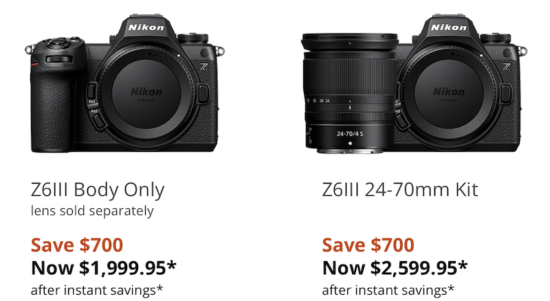 | Z6III w/24-70mm f/4S | $3296.95 | $700 | $2596.95 |