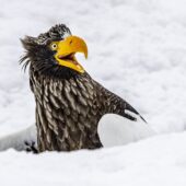 Description: This was taken in Japan where I was observing a White-Tailed Sea Eagle putting their fish in a hole and protecting it. This one had a fish and saw another Eagle coming in to try and steal it.