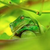 Description: Meet the Frog Prince of my little garden — he’s been lazing around guarding my grape vine, waiting for a kiss, but I think he’s just here for the grapes. This charming amphibian seems to have mistaken the vine for his royal court, lounging among the plump fruit as if he’s the monarch of the orchard.