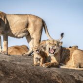 Description: While photographing a pride of lions in the Serengeti, I watched as a group of cubs channeled their innter toddler tantrum, relentlessly demanding milk and attention from their mother, much to the exasperation of the adult lions. Life in the dry season is no picnic—lions are anxiously waiting for the Great Migration and the feast it promises—but it makes for some incredible wildlife behavior and these cubs were the stars of the show. For over an hour, they followed their mother around a famous Serengeti kopje—those iconic rocky outcrops that dot the landscape—alternating between trying to suckle and play. Each time the mother, already in a foul mood from the sweltering heat, would give a quick roar of disapproval and escape the circus. But the cubs, like any persistent little ones, would chase her down, nipping at her and yelping for more attention. This back-and-forth drama played out again and again, until I captured the perfect moment: the entire pride, in perfect unison, seemed to say, “Not this again!”