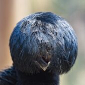 Description: An umbrella bird was sitting on the ground and seemed to be unwell or injured (we summoned a vet – not an easy find where we were.) Initially its feathers on its head wee swept back so I could see its eyes and beak but then it pulled the forwards – and disappeared!
