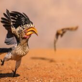 Description: This hornbill was spooked by the incoming tawny eagle and decided a quick exit was probably wise. Its ungainly departure was captured in a sequence of shots but this one for me perfectly captured the panic of the hornbill at that moment. The hornbill safely escaped although I doubt the tawny eagle was seriously interested in tackling that hornbill beak anyway.