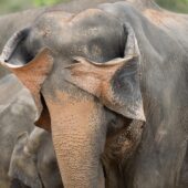 Description: A young baboon looking up as an elephant approaches, unsure whether to stand his ground or to run away. He decided to flee shortly after the picture was taken.