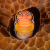 Description: I kept returning to this little smiling little fish that was popping in and out of its little home – a hole in the coral. Its face was so expressive and characterful. The challenge was to get it comfortable with me being there and then for her to face me directly. It was a peek-a-boo moment!