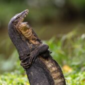 Description: Two Asian water monitors were locked in battle right by a main path in Bishan-Ang Mo Kio park, Singapore. A battle of strength and wills never looked so affectionate!
