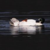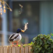 Description: On a cold morning I was outside taking photos at a local pond. The temperatures made the breath quite visible against the sun. I noticed a loud call from a garden fence nearby where this male mallard called a few times. It really looks like he is smoking a cigarette outside in its garden, since it is not allowed to smoke inside.