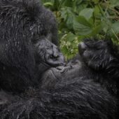 Description: Caring Gorilla mum giving her infant a big sloppy kiss!