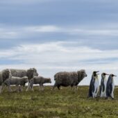 Description: Our last day of shooting in the Falkland Islands, after a week of island hopping, was at Volunteer Point, a headland on the east coast of East Falkland, northeast of Stanley. It received its name in 1815, when the sealing ship Volunteer left a boat’s crew there to collect seal skins while it went in search of opportunities elsewhere. Volunteer Point is notable for having about 2000 pairs of king penguins breed here, at the most northerly part of their range. King penguins were once nearly extinct in the Falklands, and Volunteer Point contains most of the Falkland population.I spent most of the day lying on my belly, often in the sand, watching the Kings. What a show! Not far away, a shepherd tended his flock of sheep, and it appeared for a moment that these king penguins were leading the way. Long Live the Kings!