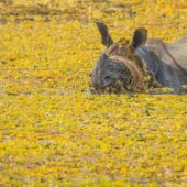 Description: A Greater One-Horned Rhino feasting on aquatic fine dining, diving underwater and getting back up with a new wig made out of his delicious meal.