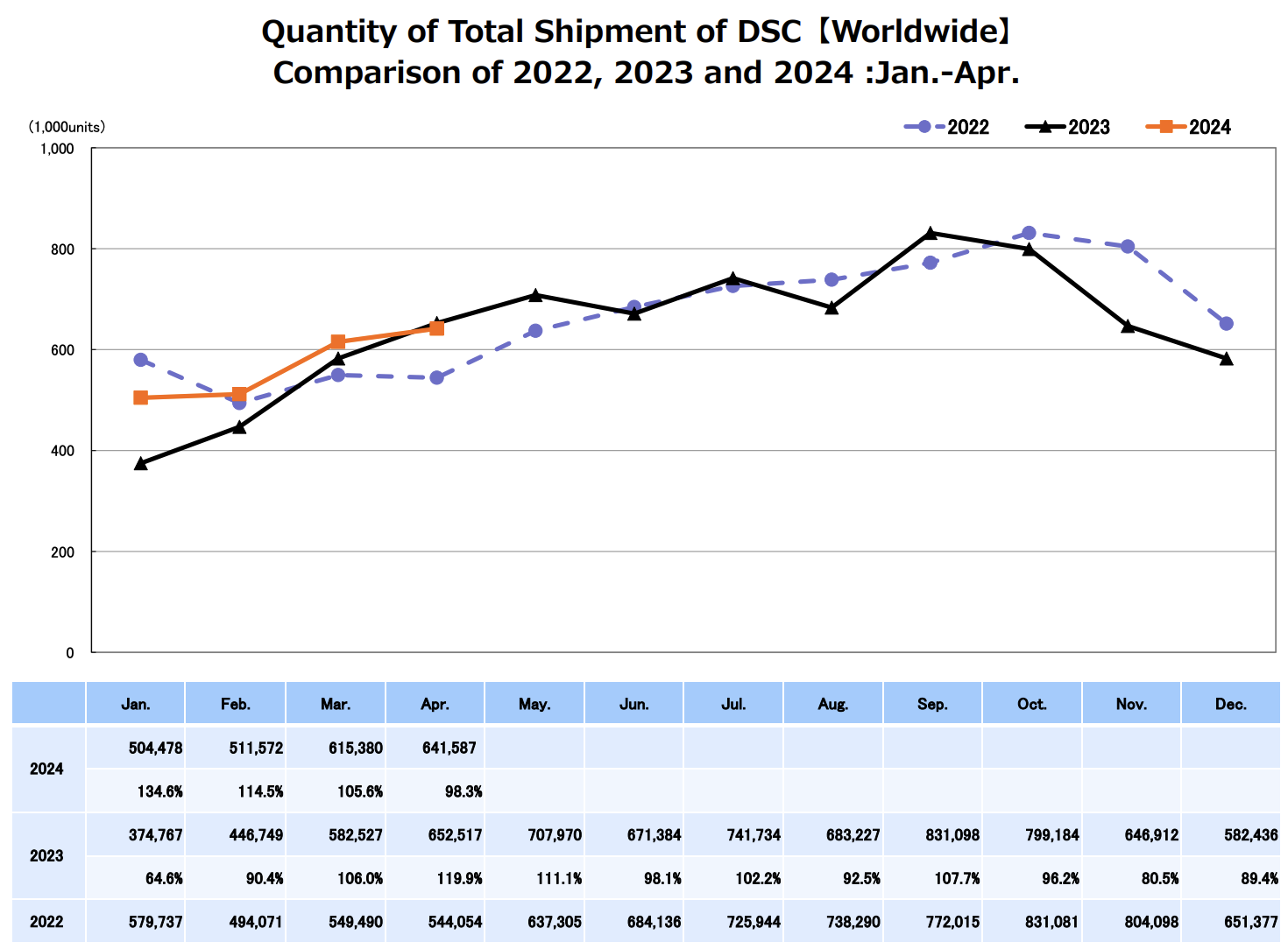 CIPA (Camera & Imaging Products Association in Japan) published their latest camera production data (orange: 2024, black: 2023, blue: 2022):