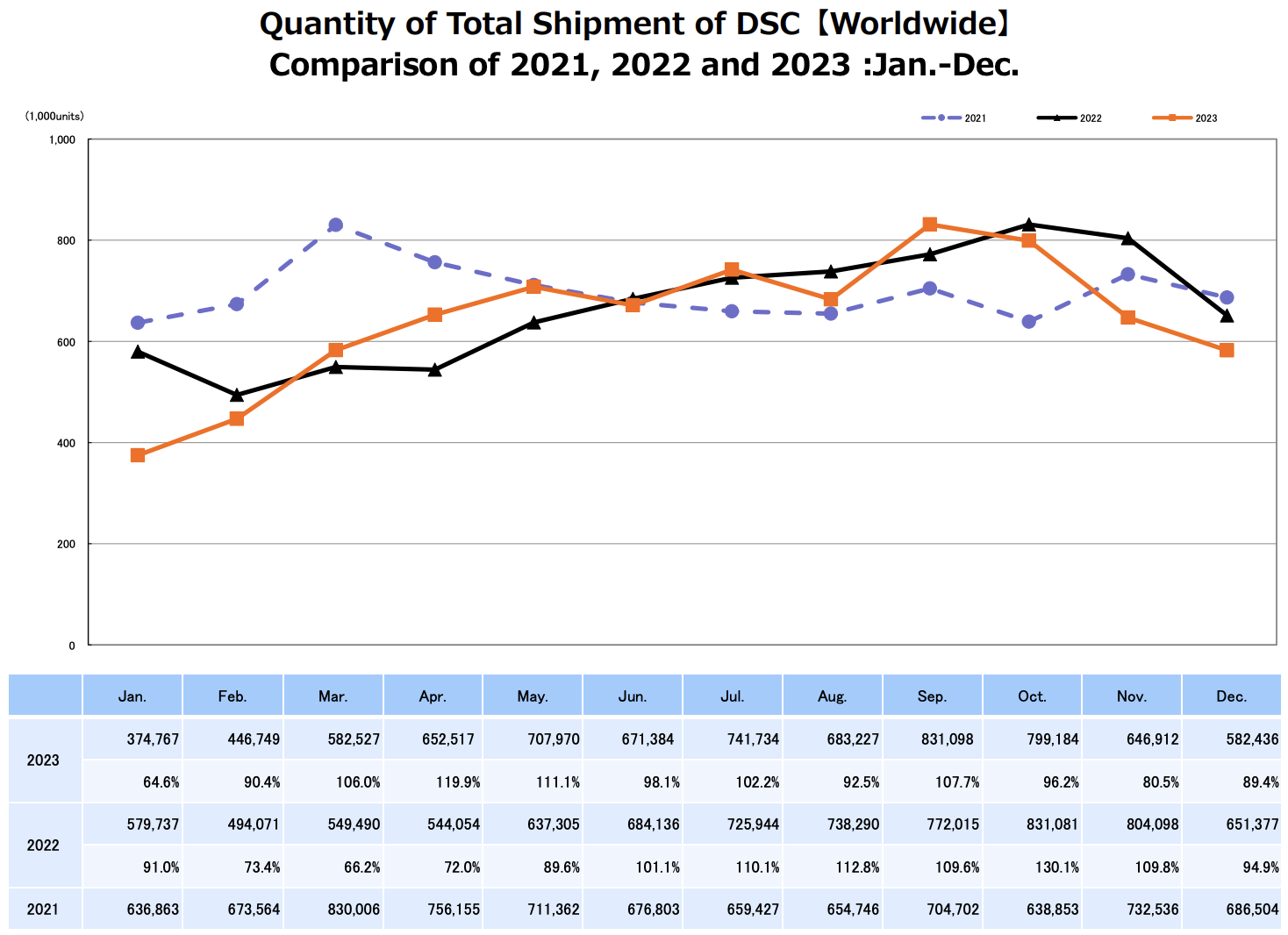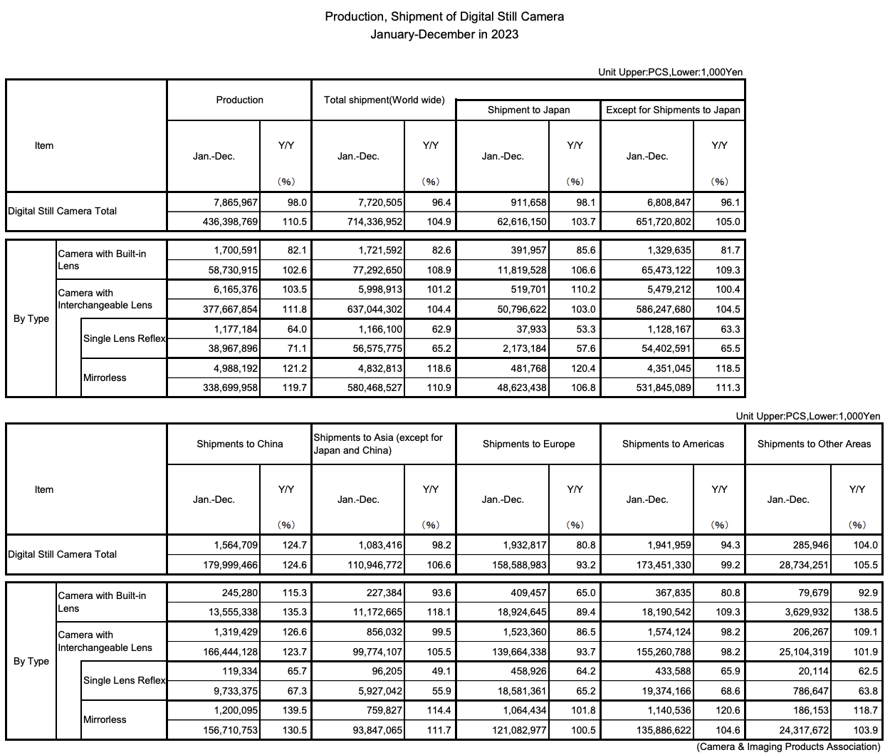 CIPA (Camera & Imaging Products Association in Japan) published their latest camera production data for 2023 (orange: 2023, black: 2022, blue: 2021):