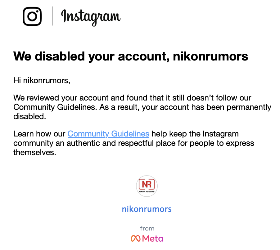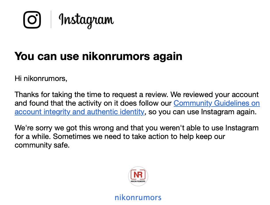 The original NikonRumors Instagram account I had for over 15 years is now back online after it was deleted by Meta without any warning or explanation in August last year. This is the email I got today: