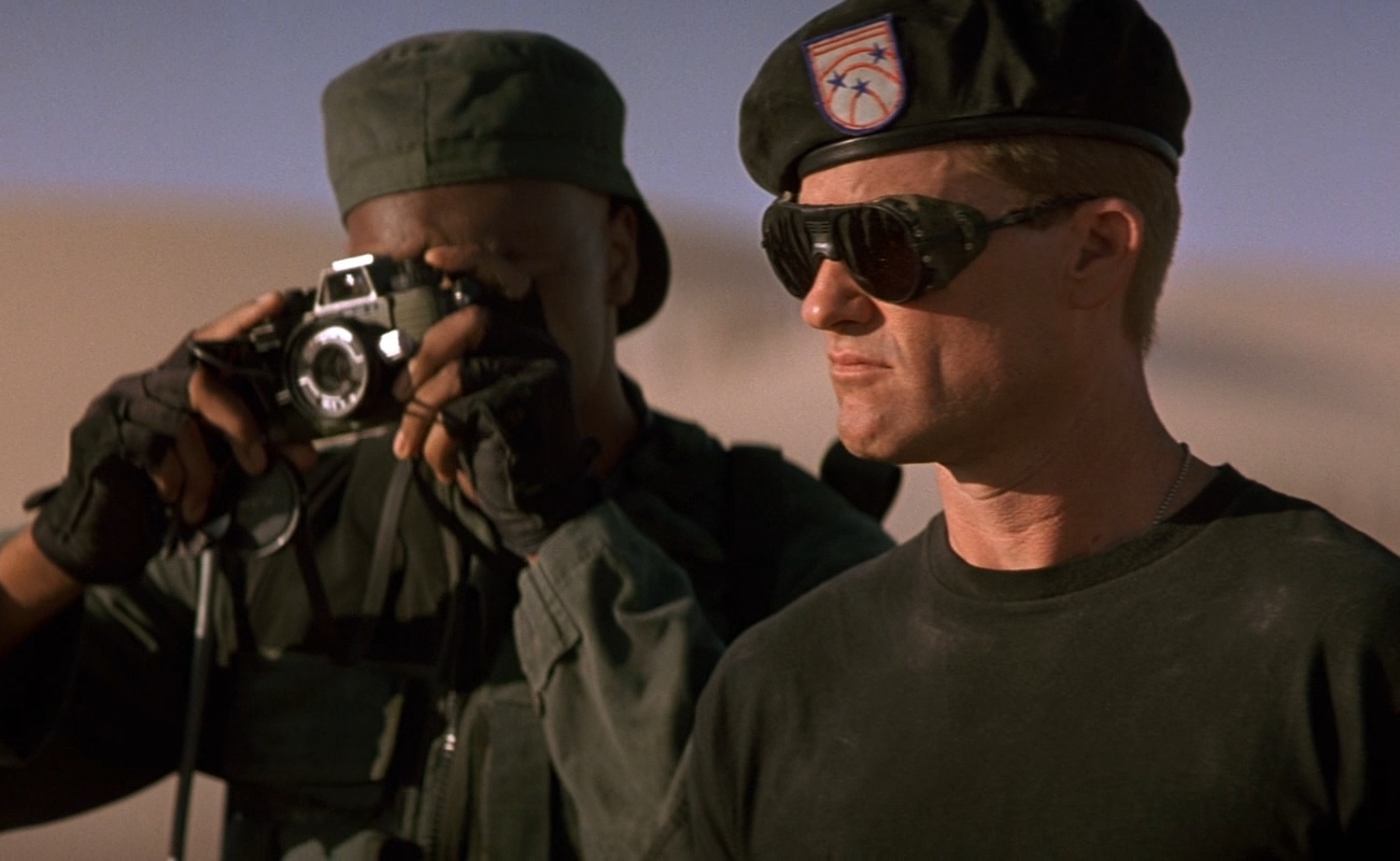 → This scene is from the 1994 movie Stargate, and it’s very funny that while the main characters are discovering an alien civilization on another planet in the desert, one of the soldiers captures this moment with a legendary Nikonos analog underwater camera.