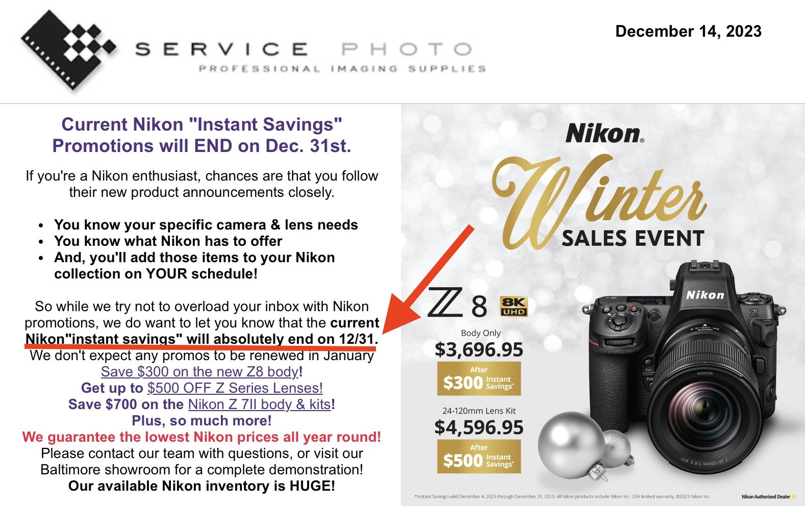 Service Photo mentioned in their latest newsletter that “the current Nikon instant savings will absolutely end on 12/31“: